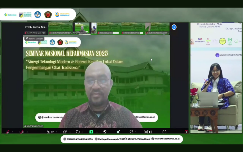 Sekolah Tinggi Ilmu Farmasi (STIFA) Pelita Mas Palu menyelenggarakan Seminar Nasional bertema “Sinergi Teknologi Modern dan Potensi Kearifan Lokal dalam Pengembangan Obat Tradisional” secara daring melalui Zoom Meeting, Sabtu (6/11/2025). Kegiatan ini merupakan bentuk kontribusi akademisi dalam pengembangan ilmu pengetahuan dan potensi lokal di bidang kefarmasian.